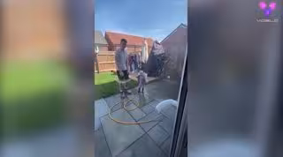 Clare sabía que la cosa se iba a poner fea, así que rápidamente entró en la casa y empezó a grabar a George con la manguera. Mientras rociaba el patio, George perdió el control y acabó dándole un baño a su padre antes de caer al suelo.