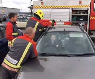 Los bomberos quisieron actuar con cautela en un primer momento, pero terminaron por romper una de las ventanas traseras del vehículo al ver que el pequeño logró hacerse con una moneda de dos peniques y se los llevaba a la boca.