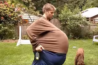 El resultado de esta farsa muestra a una persona cuya enorme barriga resulta ser la espalda de su confidente y cuyas lorzas resultan ser las piernas del mismo.