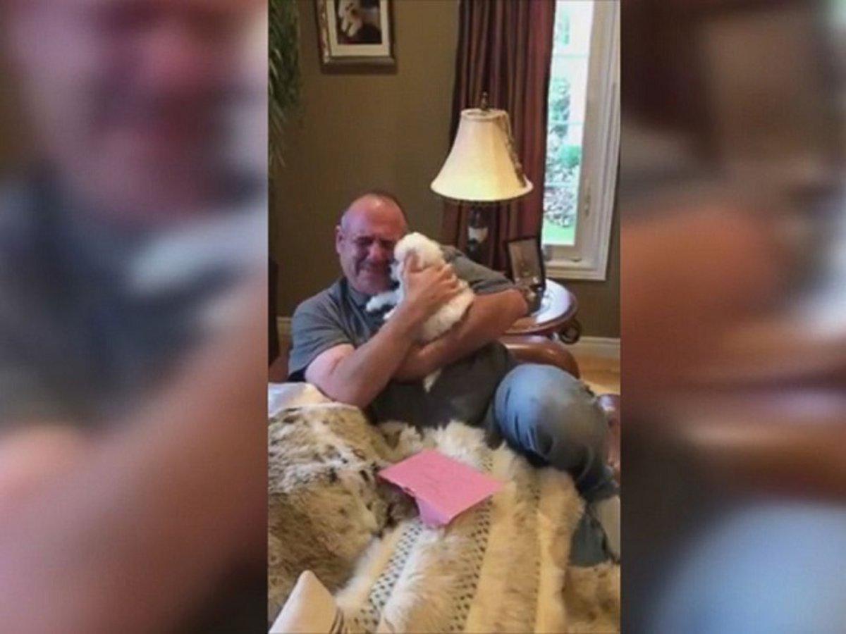 Quien verdaderamente haya amado a una mascota como a un miembro más de su familia podrá llegar a entender la emoción de este hombre cuando su familia le sorprendió por su cumpleaños con un cachorro de bichón frisé.