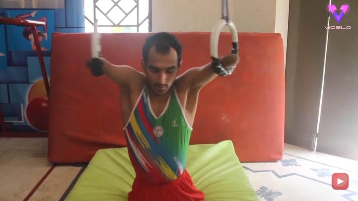 Las imágenes muestran a Azim haciendo alarde de sus increíbles habilidades gimnásticas mientras se balancea sin esfuerzo sobre los anillos y se pone de pie.