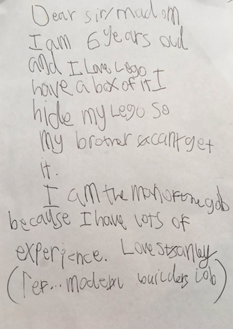 "Estimado señor/señora, tengo seis años y me encanta Lego. Tengo una caja llena de piezas de Lego. Juego a esconderlas para que mi hermano no las consiga. Soy el hombre ideal para el trabajo porque tengo mucha experiencia".