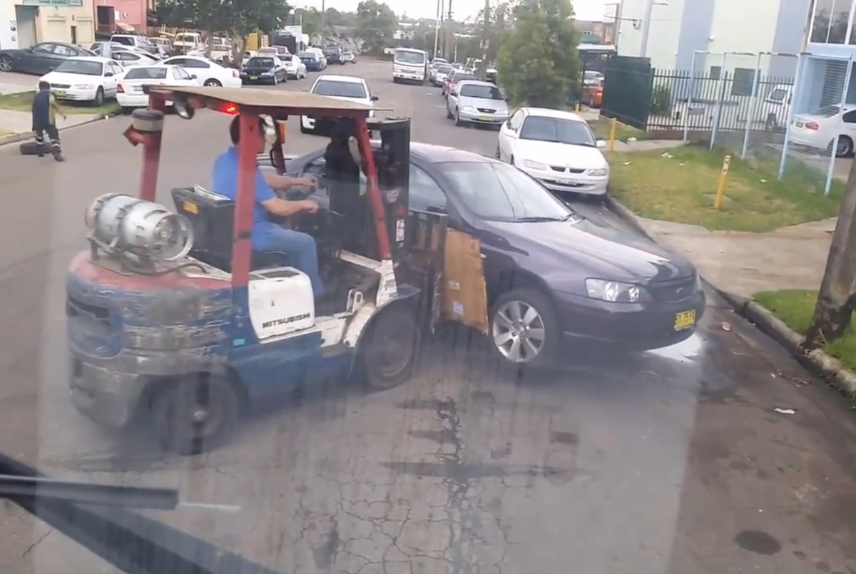 Esto segundo ha pasado en Sydney (Australia), donde unos trabajadores han retirado con un montacargas un coche situado en un lado de la acera para que un camión pudiera maniobrar sin dificultades.