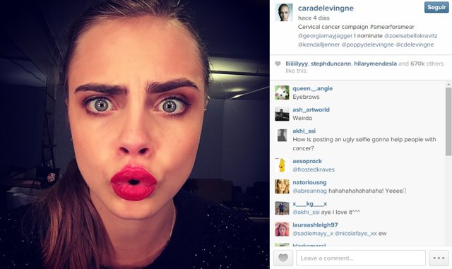 La nueva campaña puesta en marcha en redes sociales - #SmearForSmear - es una iniciativa que anima a hombres y a mujeres a compartir 'selfies' y fotografías en la que aparezcan con los labios pintados corridos y nominar a otras personas, con el fin de concienciar sobre el cáncer de cuello de útero.