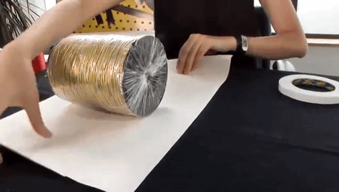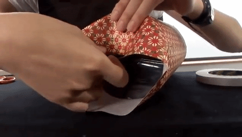 PASO 1: En primer lugar, nos aseguraremos de haber cortado el papel de regalo a medida para el objeto cilíndrico que queremos envolver. Para ello, debemos comprobar que el papel coincida de punta a punta con un punto céntrico de la tapa y la base de nuestro cilindro. De no ser así, cortaremos el papel sobrante.