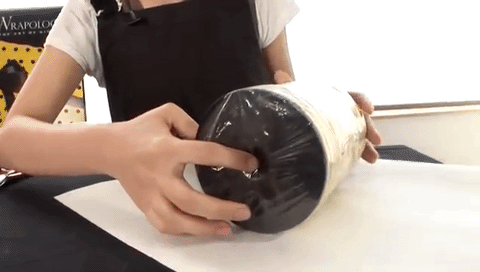 PASO 2: Con el cilindro posicionado en paralelo a nosotros y colocado en mitad del trozo papel de regalo, procedemos a envolverlo así.