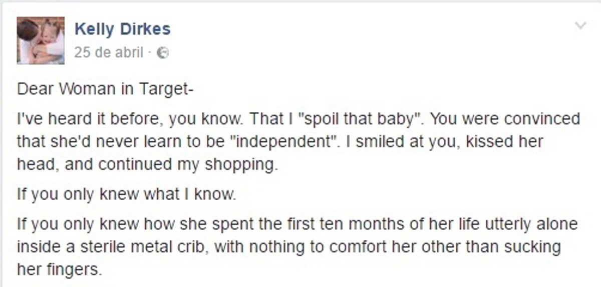 El bebé había pasado diez meses en un orfanato. Recordando lo "independiente" que la niña era cuando la llevaron a casa debido a su anterior vida en el orfanato, Kelly escribe a la mujer que le había recriminado en el supermercado: "Si usted supiera cómo se sentaba en su cuna después de despertar y nunca lloraba, porque, hasta entonces, nadie respondía".