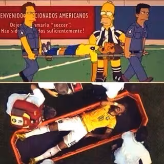 El momento en que 'il Divo' sale en camilla del terreno de juego, tal y como le pasó a Neymar en el partido contra Colombia, fue cuando el jugador brasileño cae al suelo en el área y Homer decide no pitar penalti a favor de Brasil.