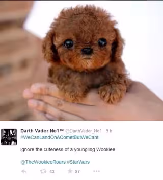"Podemos aterrizar en un cometa pero no deportar a Justin Bieber", lanzaba este miércoles por la noche más de un usuario; otros, por ejemplo, bromeaban con que "no nos es posible ignorar lo lindo que es un Wookie joven".