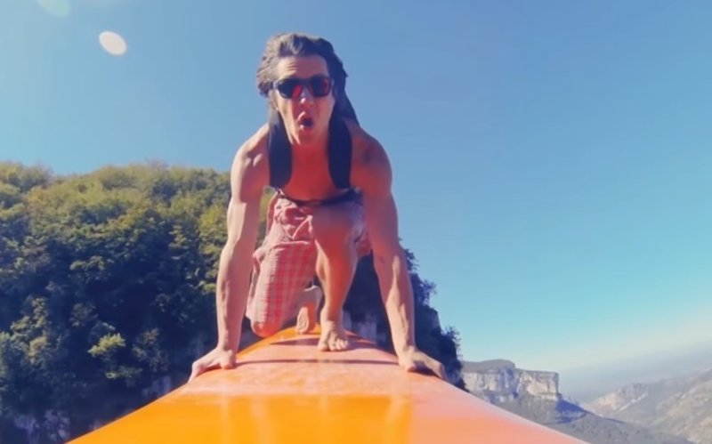 La última locura de Red Bull implica un zip line, una tabla de surf y 600 metros de altura para hacer salto base todo en uno (¿Para qué dosificar las emociones?). Y para llevar a cabo todo esto, qué mejor que contar con la colaboración de profesionales como The Fliying Frenchies, un grupo de acróbatas, atletas, artistas y skyliners a los que les gustan este tipo de retos.
