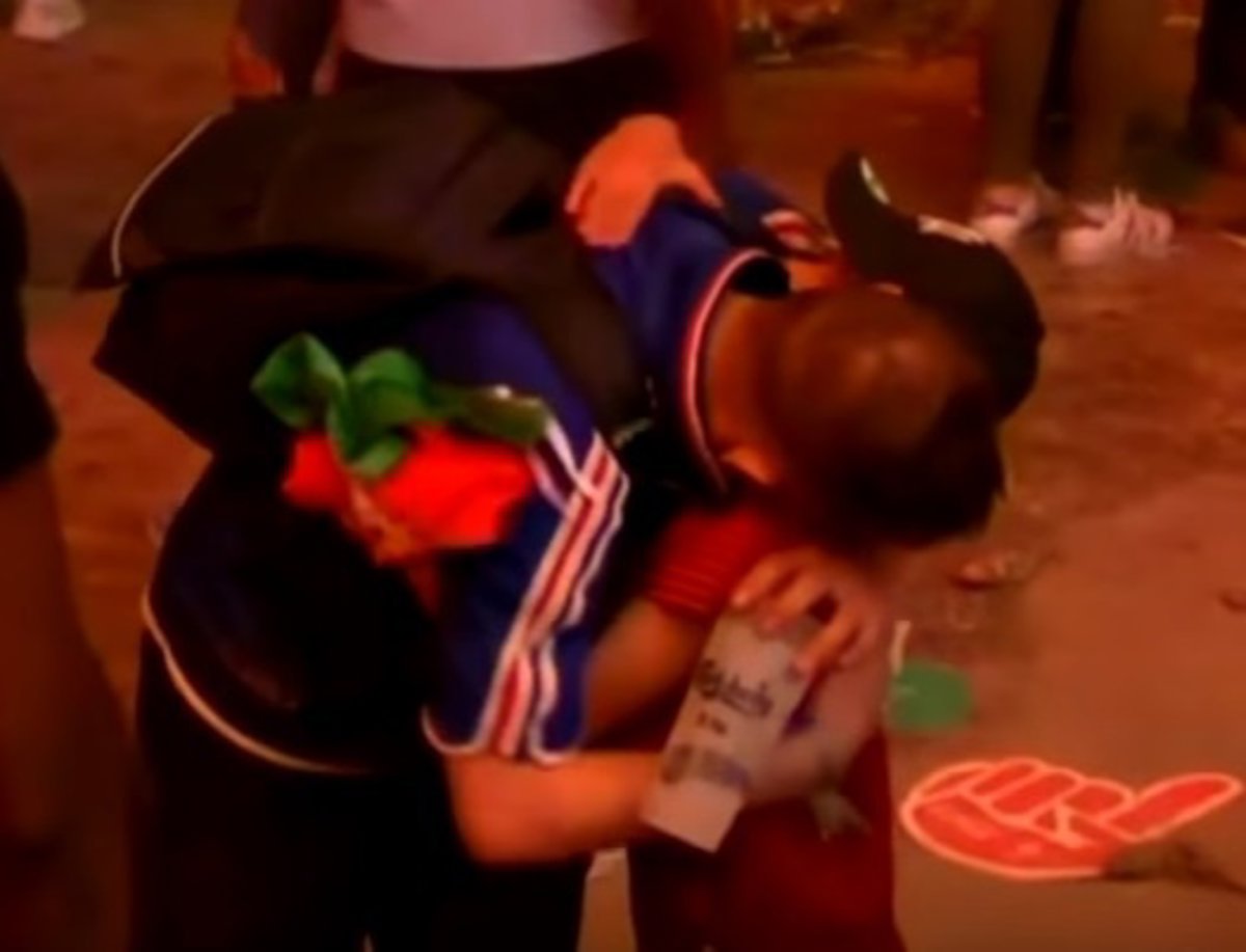 Tras advertir la acción solidaria del pequeño, el hincha francés, le levanta el dedo pulgar como queriendo expresar que está bien. El niño insiste en transmitirle consuelo con caricias y palmadas, a lo que el francés responde (ya emocionado) con un abrazo y besando la cabeza del pequeño en señal de gratitud.