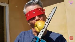 En esta ocasión, el especialista pone a prueba su destreza cortando en trozos con una motosierra una manzana que sostenía en su boca mientras tenía los ojos vendados.