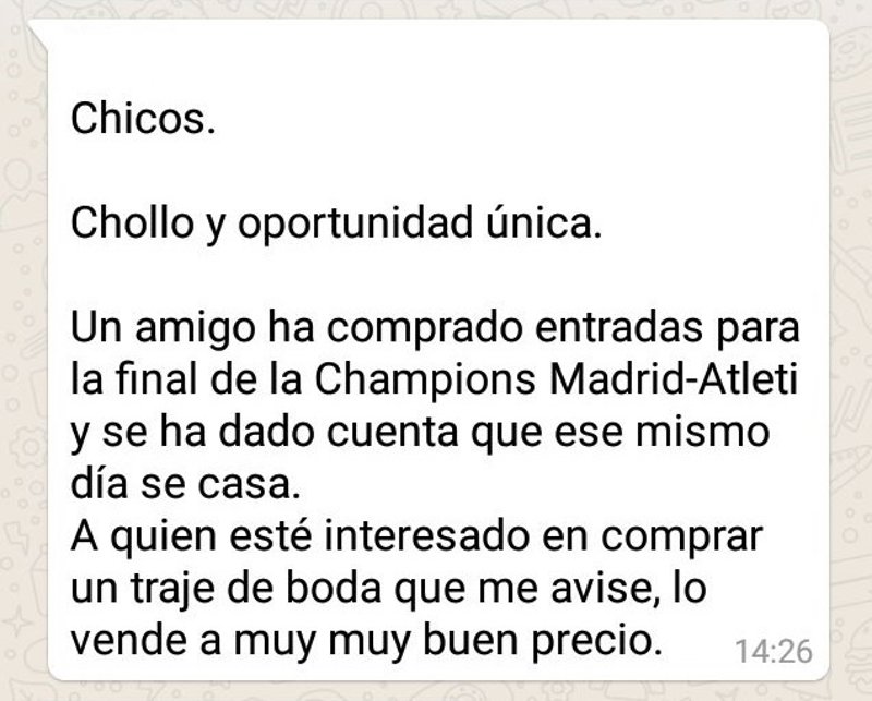 Un chollo, una oportunidad, un partido y una boda son los ingredientes principales de este cóctel de humor que no ha parado de circular por los programas de mensajería instantánea, como WhatsApp, así como en redes sociales como Twitter.