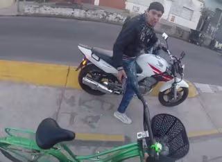 Alexander Hennessy era el más rezagado del pelotón de bicis que atravesaba el barrio de La Boca realizando un tour por Argentina. La cámara que llevaba en la cabeza pudo captar la secuencia entera de cuando un motorista armado hace que se baje de la bicicleta para que le de la mochila. El joven no dio su brazo a torcer y, por suerte, el asaltante no descargó su arma.