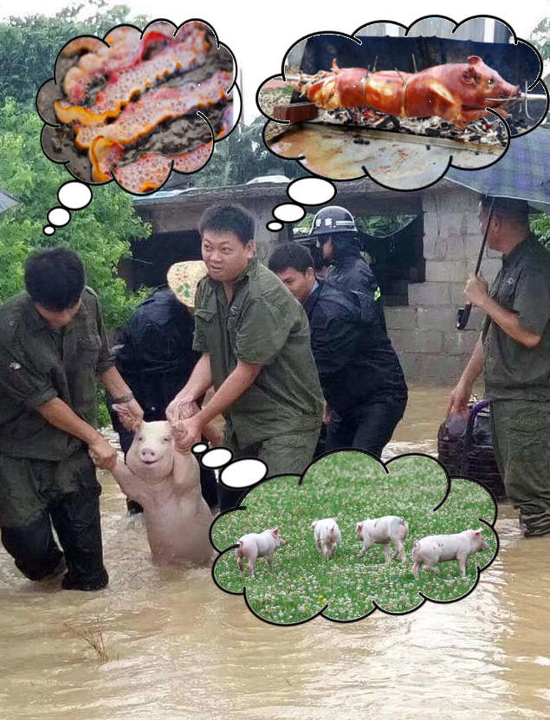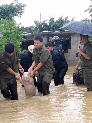 La felicidad de un cerdo tras ser rescatado de una inundación en China mientras se va alejando del peligro de la mano de dos hombres ha derretido el corazón de Internet.