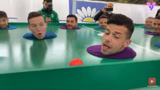 El juego de estos amigos consiste en mover una pelota por el tablero y tratar de meter gol al equipo contrario, pero, en lugar de monigotes, los participantes son los propios jugadores posicionados debajo del tablero tratando de mover la pelota soplando con su boca.