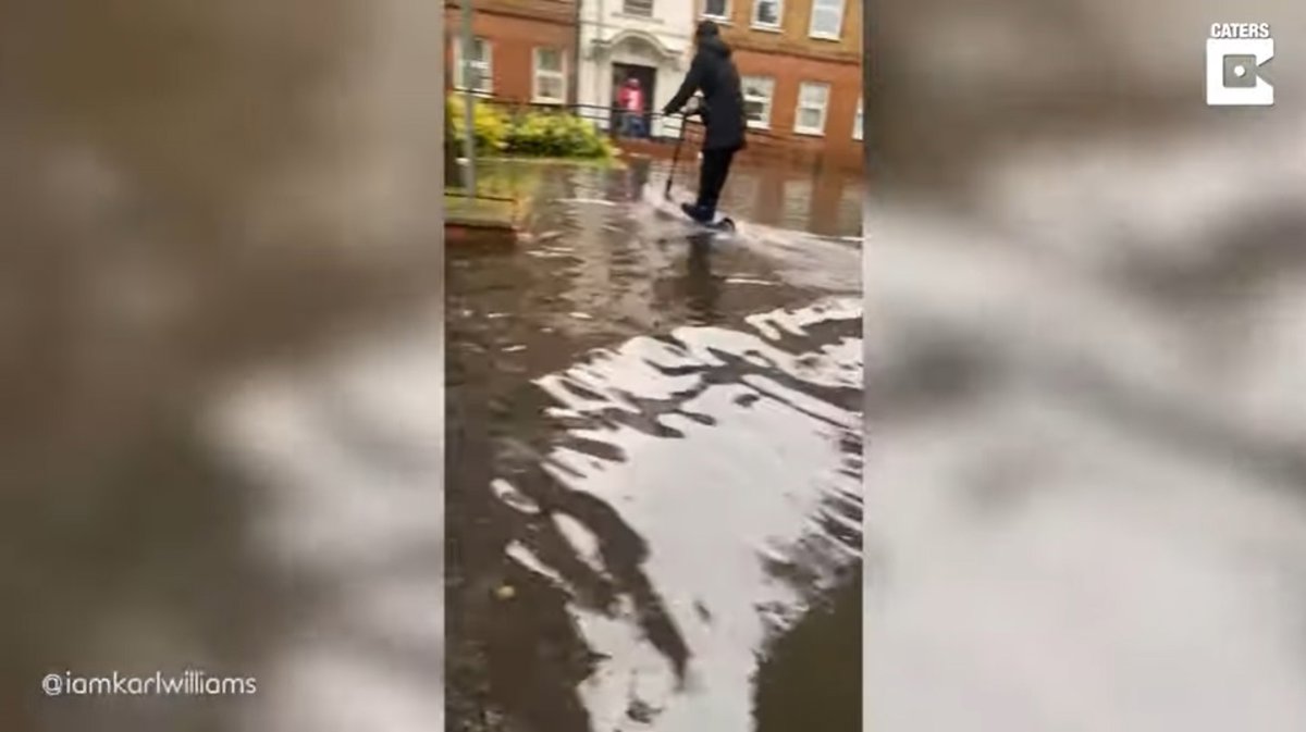 Fue aquí donde capturó inesperadamente el momento en que un transeúnte intentaba desafiar el agua en un patinete eléctrico.