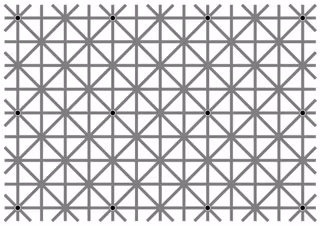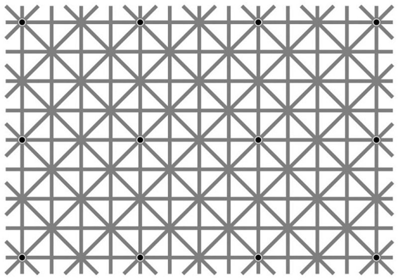 En esta imagen podrás ver que hay 12 puntos distribuidos regularmente por toda ella. Ver los 12 puntos no es el reto, consiste en verlos a la vez. Si no puedes hacerlo, no te preocupes, es imposible. Los puntos están ahí, pero la ilusión óptica hace que parezca que van apareciendo y desapareciendo según vas fijando la vista en ellos. Increíble, ¿verdad?