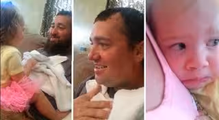 Sin haber descubierto su rostro todavía, Bradley y su mujer decidieron grabar el momento en que la pequeña Brenna descubría el ligero cambio de look de su padre. Al destapar su cara, la niña se queda impactada por un momento, dando la sensación de no reconocer a la persona que tiene delante. Al cabo de un tiempo rompe a llorar y busca desesperadamente consuelo en el regazo de su madre.