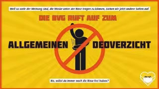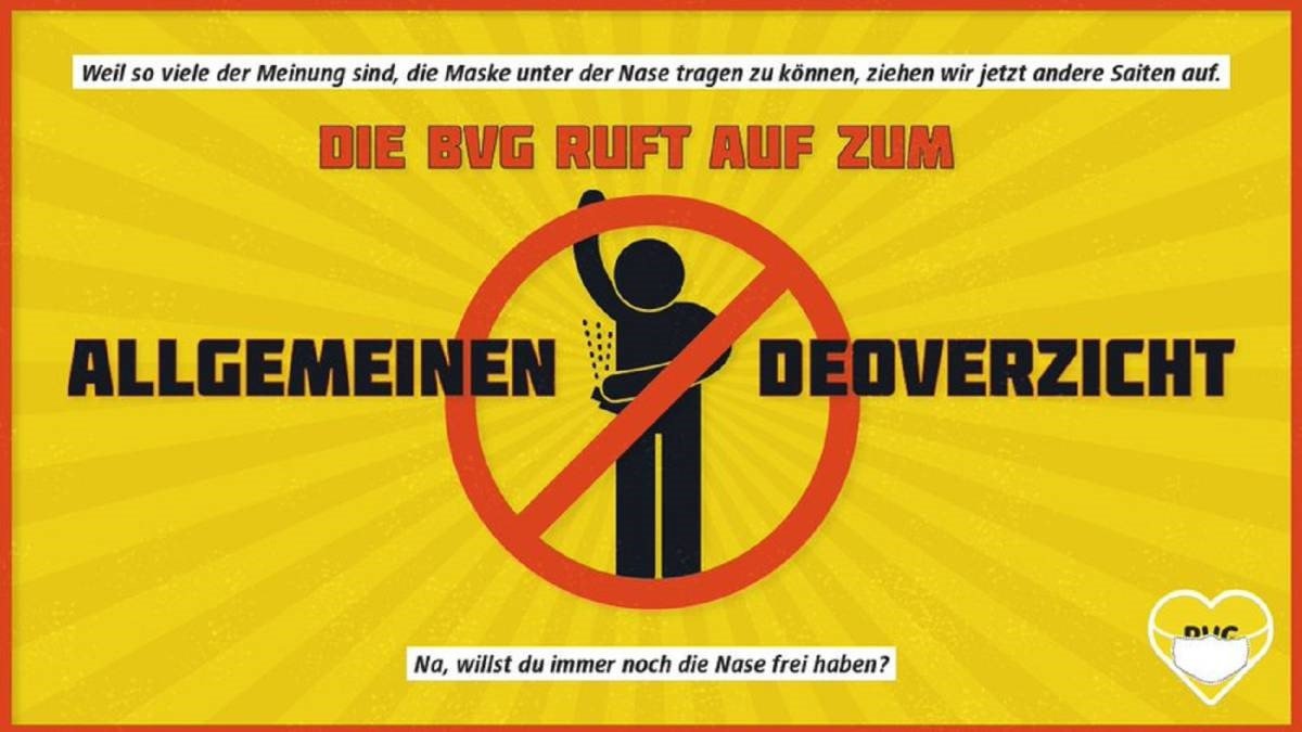El transporte público de la capital alemana ha recurrido al humor para incentivar a sus usuarios a que usen las mascarillas de forma correcta con una satírica campaña: "Deshazte del desodorante".