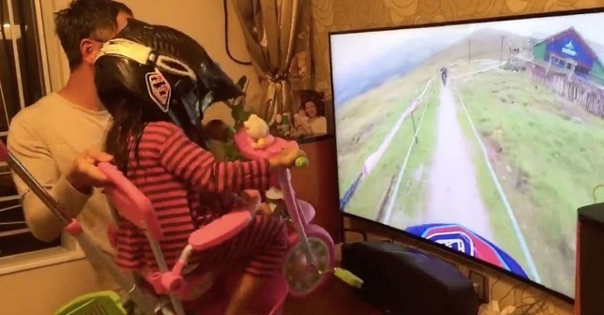 Se trata pues, de un padre creativo que, sin ir más allá, gusta de hacer feliz a su hija de 3 o 4 años y complacerla, aunque eso conlleve algún esfuerzo extra. Esfuerzo físico nos referimos. El esfuerzo necesario para sostener en volandas el peso de su hija y de un pequeño triciclo y moverlos en concordancia con las imágenes del vídeo que están reproduciendo en Internet. Como si de un simulador virtual de videojuegos se refiere. Atentos.