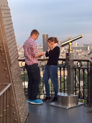 Saw this guy propose to this girl on the Eiffel Tower Sunday 6/21/15 wanted to send them the pics but was stuck in line. Help me find them!