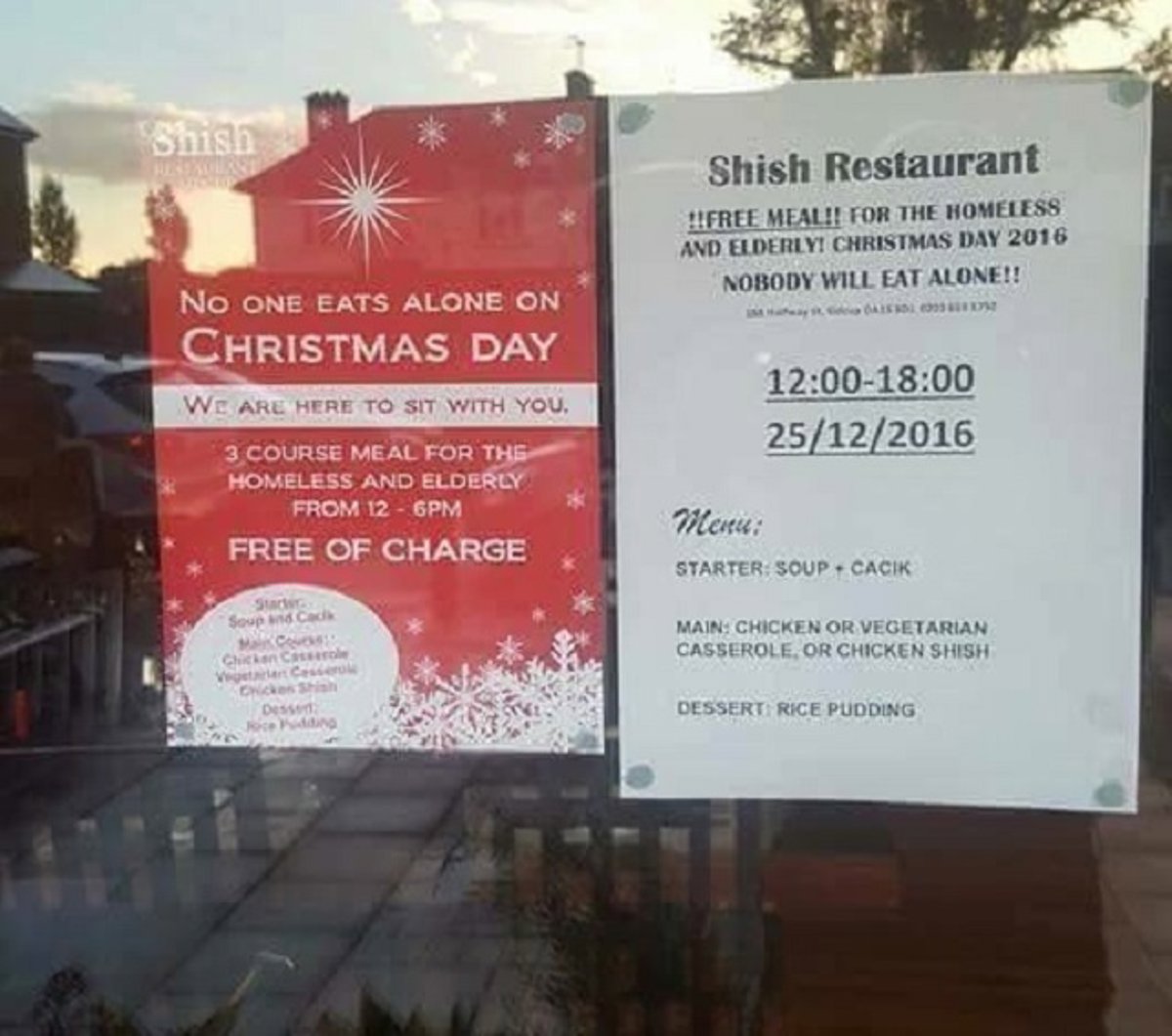 Sish, que así se llama el restaurante especializado en comida turca, abrirá sus puertas el 25 de diciembre, el Día de Navidad, para servir tres comidas gratuitas. Sus dueños lanzaron una particular invitación dirigida a aquellas personas que estén solas, especialmente ancianos y personas sin hogar.