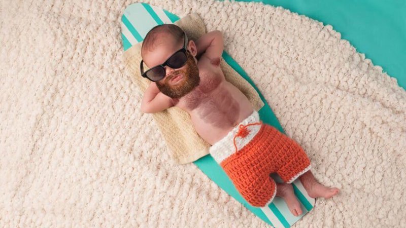 Échale un vistazo a este niño con esa pose tan chulesca sobre una mini-tabla de surf, con su gafas de sol y el traje de baño a la más última moda de la ropa de bebés. Sin ninguna duda, es un bebé con estilo. ¿Se puede estar con una postura más chulesca y relajada?