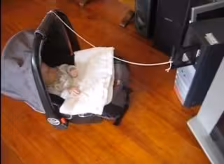Este genio ha creado un programa en Linux que abre y cierra la unidad de CD del ordenador de mesa. Con la ayuda de una cuerda atada al capazo del bebé y el otro extremo a la unidad de CD, el ordenador es capaz de acunar a un bebé hasta dormirlo.