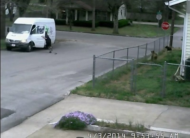 La mañana de trabajo de este repartidor de mensajería no ha podido ser más entretenida. Las cámaras de seguridad captaban el momento cuando la furgoneta con la que trabajaba bajaba por la calle en caída libre y sin control, mientras el hombre intentaba detenerla como podía y unos perros del vecindario no perdían detalle.