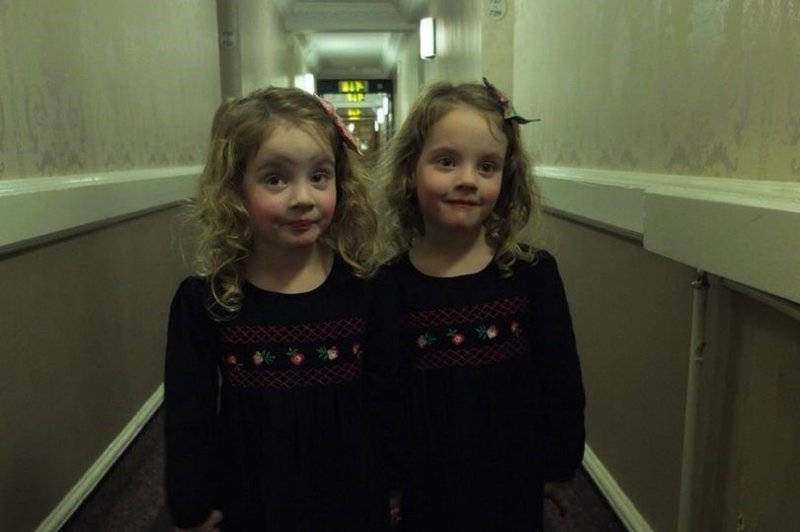 El atuendo elegido para las niñas y el lugar donde ha sido tomada la fotografía recuerdan a las espeluznantes hermanas del clásico del cine de terror 'El resplandor'.