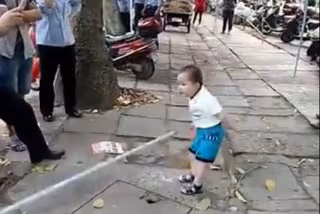 A los repetidos gritos de "¡no toque a mi abuela!" o "¡Fuera de aquí, no toquéis a mi abuela!", el niño se hace protagonista de la escena mientras sujeta un tubo de acero de casi el doble de su altura para tratar de tener ventaja con el Chengguan.