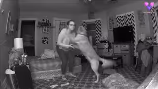Una cámara de vigilancia nocturna capturó el momento en que Jax, un Golden Retriever de dos años, consigue evitar una caída inminente de su dueña tras un tropiezo.