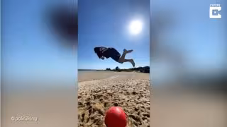 El hombre se grabó realizando piruetas en el aire después de saltar sobre una pelota de goma instalada en la arena de la playa de Barcelona, España.
