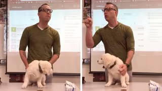 En un vídeo que se ha hecho muy popular en redes sociales, el profesor con tono de sargento interrumpe la clase para llamar la atención de sus alumnos. A continuación, como parte de su teatrillo, sale de la clase hasta en dos ocasiones para coger a los perros y presentárselos, para finalmente amenazar con liquidarlos, si no estudian.