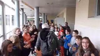 Los 700 alumnos y profesores del Colegio Paul-Fort prepararon su despedida formando un corro de honor desde los pasillos hasta la salida del centro que arropó con una sonada y cálida ovación a quien para ellos había significado mucho.