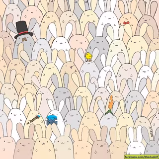 Con motivo de la Pascua, el artista húngaro Gergely Dudás, más conocido como Dudolf, planteó un nuevo desafío visual en redes sociales: encontrar el huevo escondido entre una multitud de conejos de Pascua. Y tal y como sucedió en ocasiones anteriores, el reto se volvió viral compartiéndose a través de Facebook y Twitter.