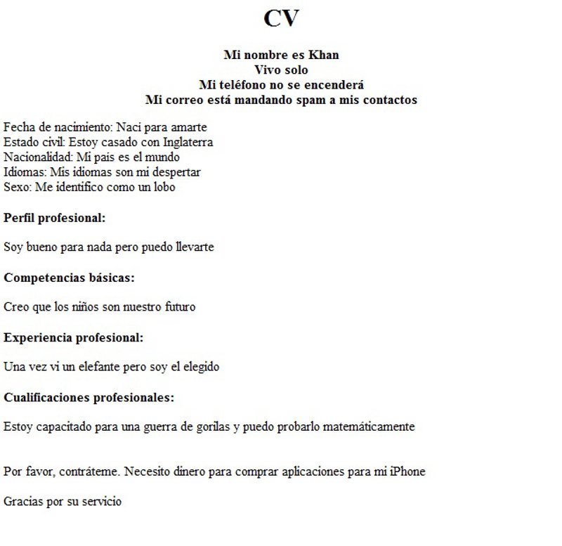 Gillies remarca en su fecha de nacimiento que "nació para amarte", un detalle que no pasará desapercibido para las empresas. También señaló que es un "bueno para nada" (aquí claramente la fastidió, si lo que quería era conseguir trabajo). Entre sus competencias básicas destaca que "está capacitado para la guerra de gorilas" (algo que "puede demostrar matemáticamente", según dice), que "cree que los niños son nuestro futuro" y que "una vez vio un elefante"...