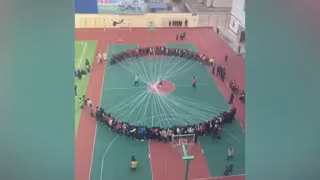 El clip muestra a docenas de niños enfrentados en dos grandes grupos posicionados en semicírculos mientras sujetan cada uno una cuerda y la balancean de un lado a otro al mismo tiempo. El juego consiste en coordinarse todos a la vez para que el niño que se encuentra en el centro pueda saltar la comba.