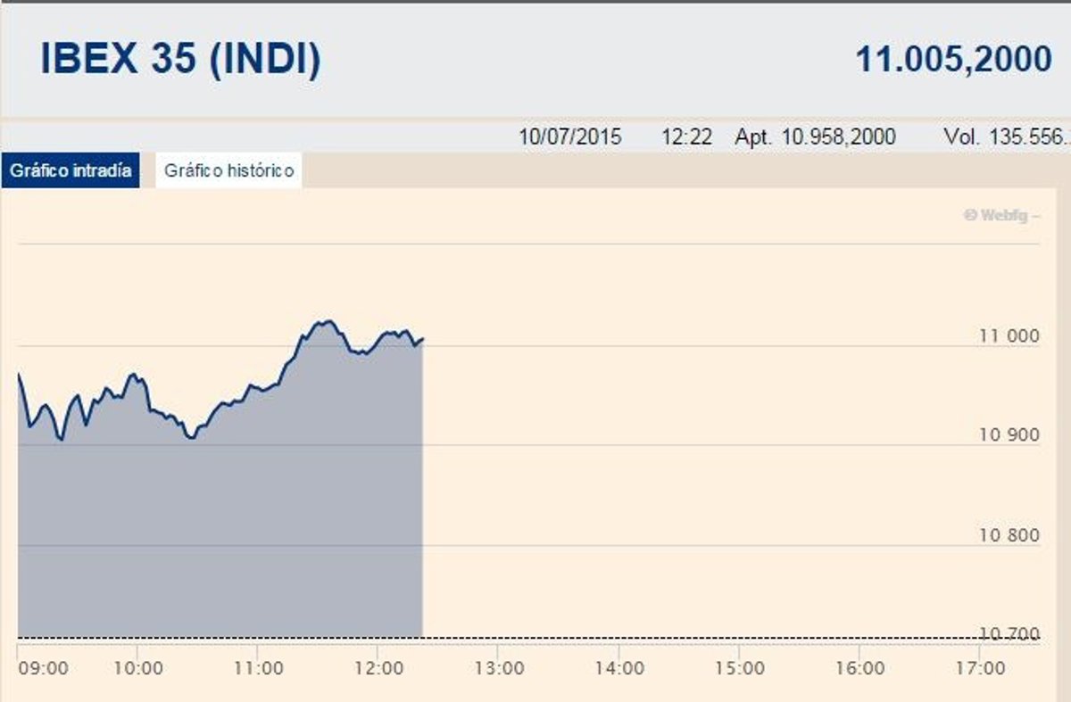 El Ibex 35 se impulsaba un 2,83% en la media sesión de este viernes, lo que llevaba al selectivo a conquistar nuevamente los 11.000 enteros (11.009,1) ante los avances en la negociación para ponerle punto y final a la crisis griega.