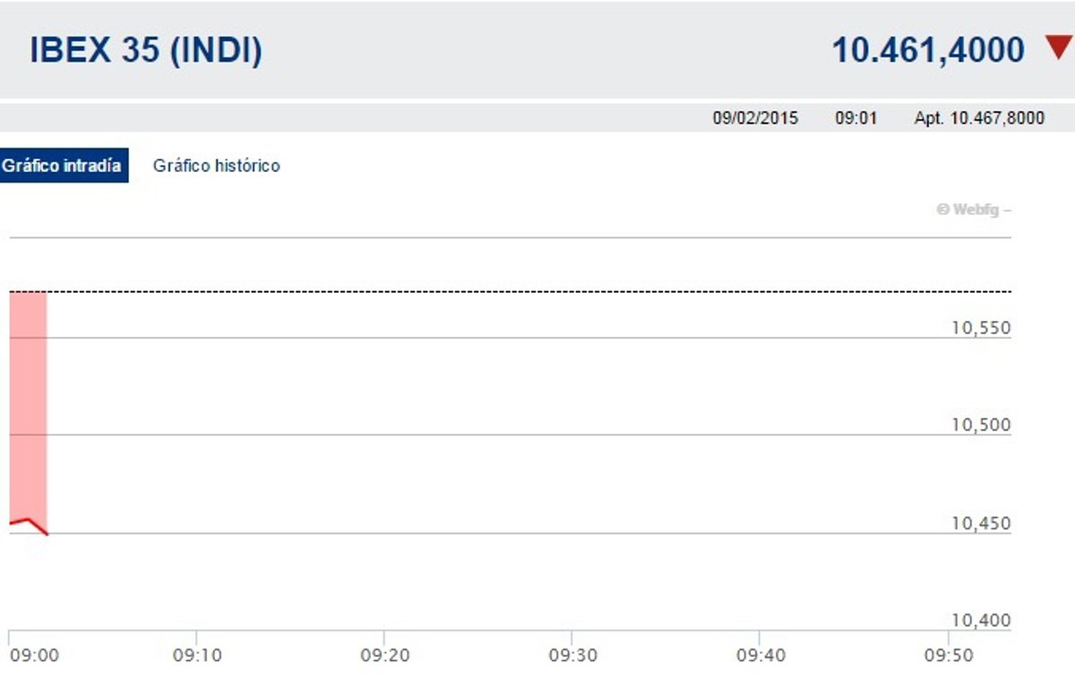 El Ibex 35 ha comenzado este lunes la sesión con una caída del 1,08%, lo que le llevaba a cotizar en los 10.458,4 enteros a las 9.01 horas, mientras que la prima de riesgo subía hasta los 117,20 puntos básicos, con la rentabilidad del bono a diez años en el 1,53%.