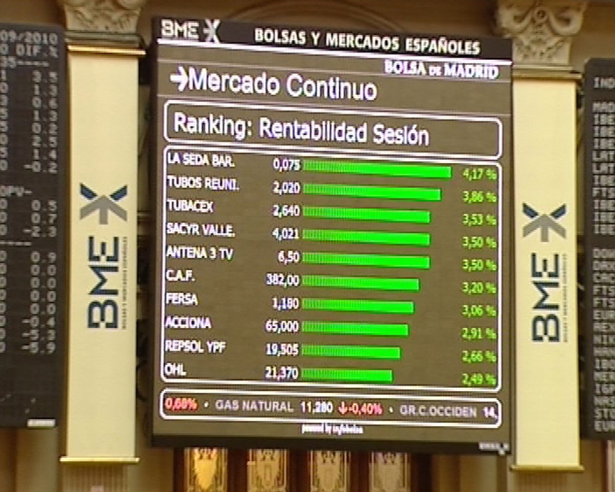 El resto de subidas en el mercado español eran para Gamesa (+3,24%), Telecinco (+2,54%), Iberia (+1,79%), Iberdrola Renovables (+1,47%), Mapfre (+1,38%), Ferrovial y REE (+1,47%), FCC (+1,33%), Repsol YPF (+0,59%), Bankinter (+0,2%) y Banesto (+0,02%).