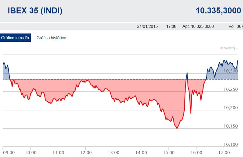 El Ibex 35 ha subido un 0,5% al cierre de mercado y se ha anotado su quinta sesión al alza consecutiva, lo que le ha permitido avanzar hasta los 10.335 puntos. En las últimas cinco sesiones, desde la decisión del Banco Nacional de Suiza (BNS) de abandonar el cambio mínimo francos suizos frente al euro, el selectivo ha sumado un 5%.