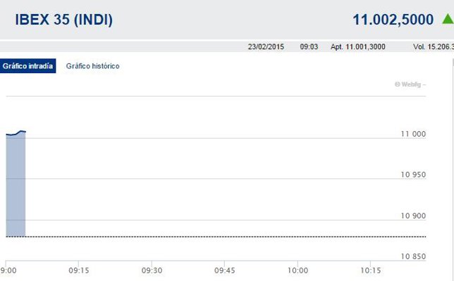 El Ibex 35 ha comenzado este lunes la sesión con una subida del 1,14%, lo que le llevaba a cotizar en los 11.002,9 enteros a las 9.01 horas, mientras que la prima de riesgo caía hasta los 104,90 puntos básicos, con la rentabilidad del bono a diez años en el 1,43%.