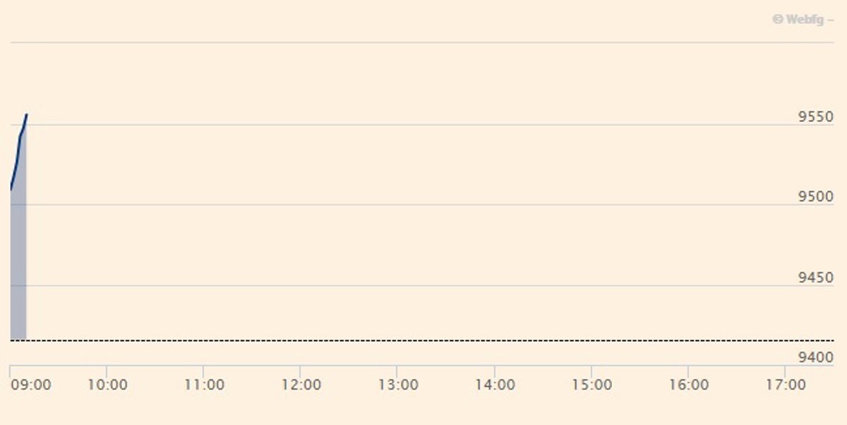 De esta forma, el selectivo madrileño iniciaba anclado en la cota psicológica de los 9.500 enteros, con todos los valores en verde, al tiempo que la rentabilidad exigida a los bonos españoles con vencimiento a diez años en los mercados secundarios de deuda se situaba en el 1,80%.