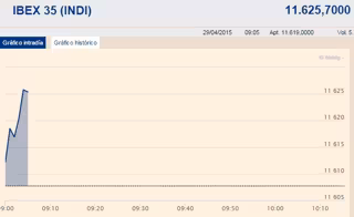 El índice Ibex 35 de la Bolsa de Madrid ha comenzado la sesión de este miércoles con tendencia positiva y cotizaba en los 11.612,2 puntos, un 0,04% por encima del cierre de la sesión anterior, con los inversores pendientes de los resultados empresariales y la reunión de la Reserva Federal de EEUU (Fed).