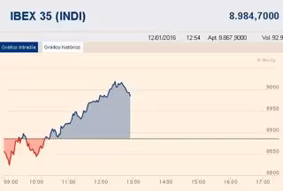 El Ibex 35 aceleraba más de un 1% a media sesión y rozaba la cota psicológica de los 9.000 puntos, en una jornada de rebote extendida entre las principales plazas de Europa. Mientras, la prima de riesgo española repuntaba ligeramente hasta los 127 puntos básicos.