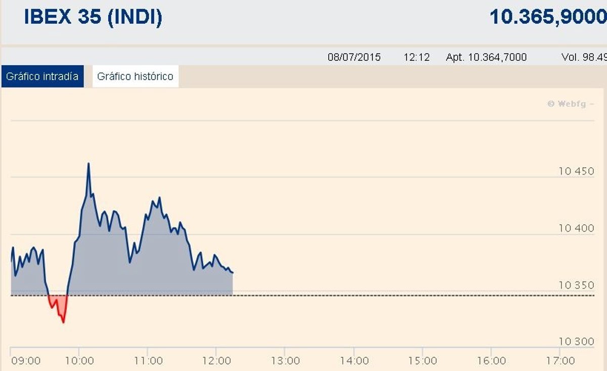 El Ibex 35 aguantaba las ganancias a media sesión (+0,3%) a la espera de que desencallen las negociaciones sobre un acuerdo entre Grecia y sus acreedores. El selectivo buscaba recuperar los 10.400 puntos.