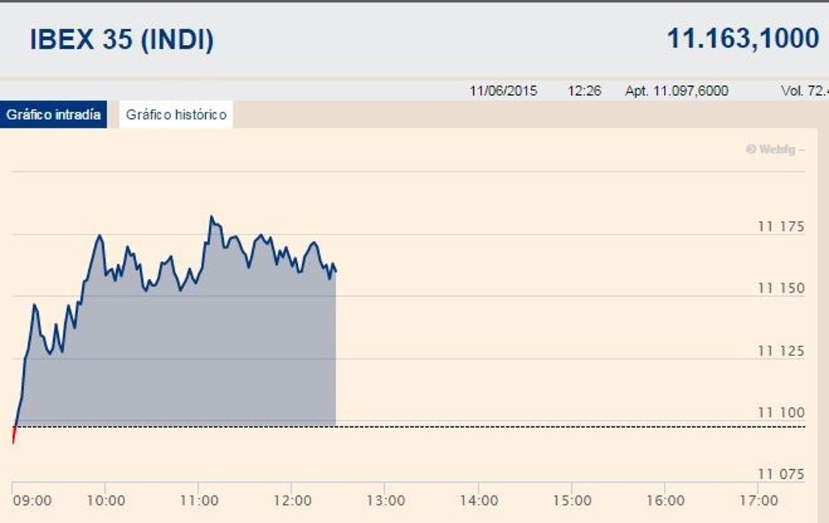 El Ibex 35 repuntaba un 0,58% en la media sesión de este jueves, lo que llevaba al selectivo a alcanzar nuevamente los 11.100 enteros (11.161,4), un día más pendiente de Grecia. En el mercado de deuda, la prima de riesgo se colocaba en 128 puntos básicos, con la rentabilidad del bono a diez años en el 2,240%.