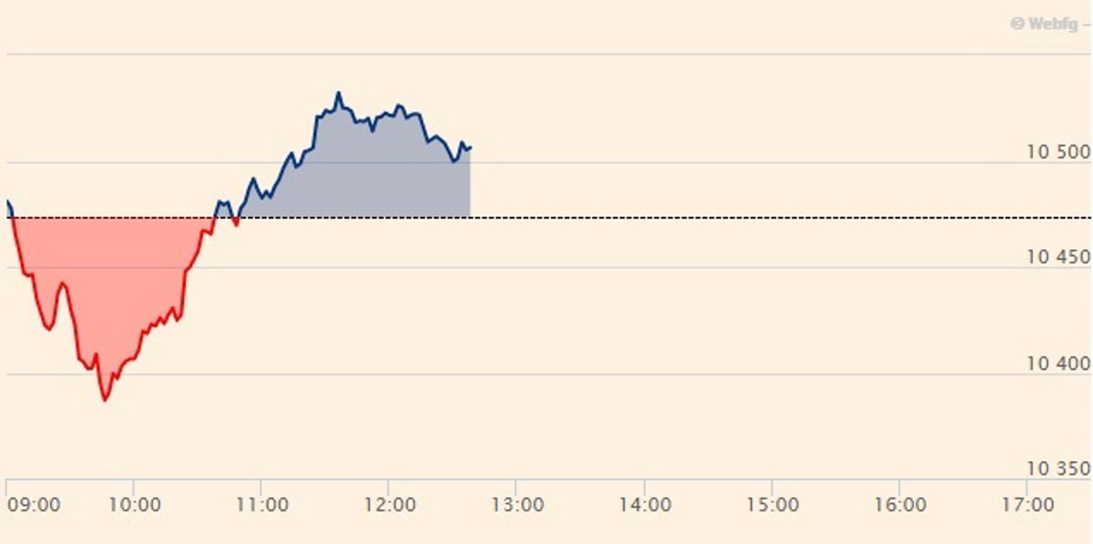 El Ibex 35 ampliaba sus ganancias a media sesión al 0,3% y lograba reconquistar la cota de los 10.500 puntos, mientras que la prima de riesgo se mantenía estable los 115 puntos básicos, con el interés del bono a diez años en el 1,7%.